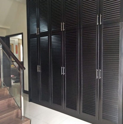 Большой жалюзийный шкаф в синем цвете , сочетающий гардероюную часть и отдельное выделенное хозяйственной хранение.
